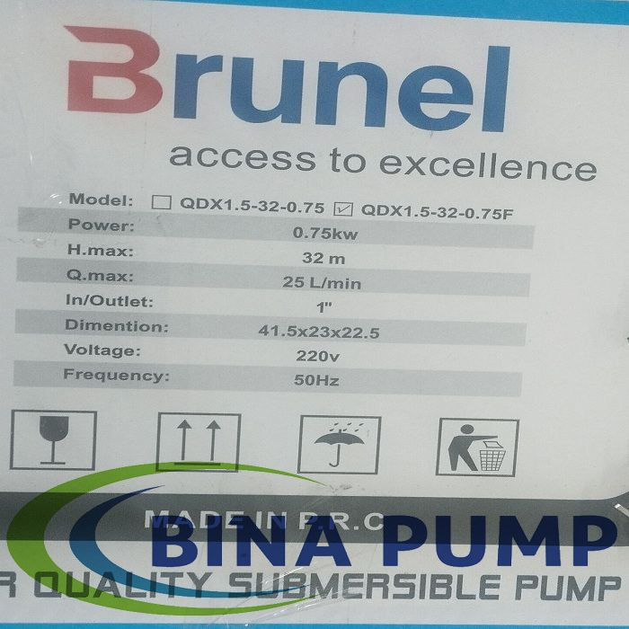 پمپ کف کش 32 متری 1اینچ فلوتر دار برونل مدل QDX1.5-32-0.75-F به صورت تکفاز و مورد استفاده در آب تمیز می باشدبدنه این محصول از جنس آلمینیوم و پایه مکش آن از جنس چدن است. این برند ساخت کشور چین و از جمله کفکش های با کیفیت و ارزان قیمت می باشد. قدرت الکتروموتور 1 اسب بخار، حداکثر آبدهی 25 لیتر بر دقیقه، حداکثر ارتفاع32 متر و حداکثر دمای کاری 40 درجه سانتی گراد می باشد.