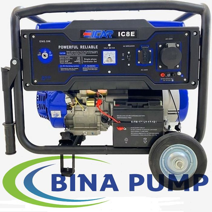 موتور برق 8 کیلو وات از برند خوش نام ایکار ساخت کشور چین می باشد سوخت این محصول بنزین بوده و از یک موتور تک سیلندر 4 زمانه بهره میبرد که در این حالت راندمان بسیار بالایی داراست نحوه استارت و روشن شدن این محصول با استفاده از هندل طنابی و استارت برقی است و در حین کار صدای بسیار کمی تولید می کند این محصول مناسب جهت مصارف باغی و کشاورزی یا به عنوان تامین کننده برق مورد نیاز در کارگاه های صنعتی یا منازل می باشد.سیم پیچی ژنراتور این موتور برق تماما از جنس مس است.این محصول دارای چرخ تو پر فلزی دسته و باتری می باشد شاسی فلز یاین محصول یکی از با کیفیت ترین شاسی ها در بین موتور برق های موجود در بازار ایران است.