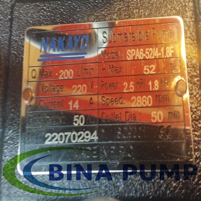 پمپ کفکش 52 متری 2اینچ فلوتر دار ناکایو مدل SPA6-52/4-1.8-F دارای 3 پروانه با بدنه استیل و قسمت مکش آب از جنس چدن جهت جلو گیری از پوسیدگی و مقاومت در برابر آب های خورنده می باشد سیم پیچی این محصول از جنس مس و دارای موتور با توان 2.5 اسب بخار و ولتاژ 14 آمپر که آب را تا ارتفاع 52 متری پمپاژ می نماید در صورت عدم دسترسی به برق شهری یا صنعتی می توان با استفاده از موتور برق از این محصول استفاده نمود سایز خروجی آب این محصول 2 اینچ می باشد و دارای فلوتر برقی جهت محافظت در برابر بی آبی مناسب جهت مصارف باغی کشاورزی تخلیه چاه های نیم عمیق.