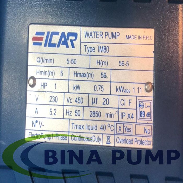 پمپ آب یک اسب محیطی ایکار مدل IM80 ابن محصول با سیم پیچی تمام مس و شافت استیل و پروانه برنجی می تواند یکی از بهترین گزینه ها جهت مصارف خانگی باغی و... باشد از این محصول می توان برای تقویت فشار آب خانگی و انتقال آب در باغات استفاده نمود این محصول ساخت کشور چین با ارتفاع پمپاژ 55 متر می باشد سایز ورودی و خروجی پمپ 1 اینچ و دارای پیچ هوا گیری است.